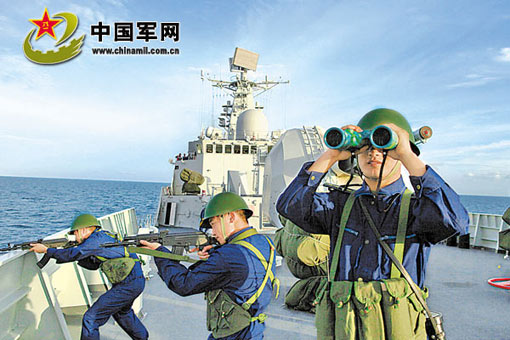 圖:“廣州”號(hào)導(dǎo)彈驅(qū)逐艦進(jìn)行反海盜演練
