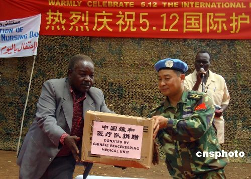 5月11日,中國赴蘇丹維和醫(yī)療隊醫(yī)護人員與蘇丹西加扎勒河州州立醫(yī)院的同行們歡聚一堂,慶祝國際護士節(jié)。歡慶活動中,我維和醫(yī)療隊捐贈了該院急需的抗生素、抗瘧疾、醫(yī)用耗材等六大類近50個品種的醫(yī)療物資,醫(yī)療隊將與州立醫(yī)院開展更廣泛的醫(yī)護交流和合作,為改善當?shù)氐尼t(yī)療衛(wèi)生狀況做出力所能及的貢獻。熱情淳樸的當?shù)孛癖娪米盥≈氐亩Y遇接待了中國朋友們。中新社發(fā) 隗蒙 陳晨 攝