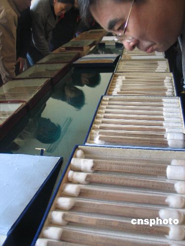 十月十八日,蘭州市民在甘肅簡牘展覽室欣賞兩千年前的漢簡。甘肅簡牘保護(hù)研究中心經(jīng)批準(zhǔn)成立,并于十月十八日揭牌,長期擠放于陰冷庫房里的萬枚珍貴簡牘正式宣告“換新房”。甘肅先后出土簡牘六萬余枚,尤以漢簡數(shù)量最多,現(xiàn)分別收藏于英國倫敦的大英圖書館、臺北南港歷史語言研究所和甘肅。因人員、經(jīng)費(fèi)原因,漢簡在甘肅保存條件很差,出現(xiàn)了變形損毀等嚴(yán)重情況。簡牘,是中華民族先民們對政治、軍事、經(jīng)濟(jì)、社會(huì)、文化等活動(dòng)的記錄。中新社發(fā) 殷春永 攝