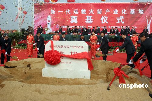 十月三十日,中國國防科學(xué)技術(shù)工業(yè)委員會、天津市政府官員同中國航天科技集團公司及該公司所屬中國運載火箭技術(shù)研究院負(fù)責(zé)人等,在天津濱海新區(qū)為中國新一代運載火箭產(chǎn)業(yè)化基地?fù)]鍬奠基。中國新一代運載火箭產(chǎn)業(yè)化基地項目,是新一代運載火箭研制工程的基礎(chǔ)保證,也是后續(xù)批量生產(chǎn)和產(chǎn)業(yè)化、軍民結(jié)合的航天高科技重要基地。該項目總投資約數(shù)十億元人民幣,總占地面積約三千畝,分為一期工程和二期工程。建成后將滿足中國未來三十至五十年發(fā)展空間技術(shù)及和平利用空間的需要,實現(xiàn)運載技術(shù)跨越式發(fā)展和航天可持續(xù)發(fā)展,對引領(lǐng)中國高科技產(chǎn)業(yè)發(fā)展有著重大的輻射和推動作用。中新社發(fā) 孫自法 攝
