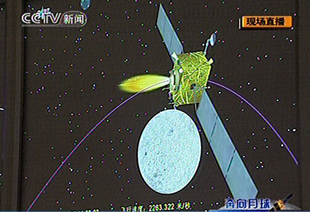11月5日11時(shí)15分,嫦娥一號衛(wèi)星主發(fā)動機(jī)點(diǎn)火,第一次近月制動開始。