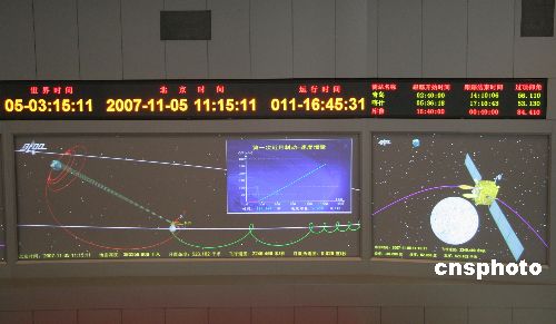 北京時間11月5日11時37分,北京航天飛行控制中心對“嫦娥一號”衛(wèi)星成功實施了第一次近月制動,順利完成第一次“太空剎車減速”動作,月球捕獲衛(wèi)星!版隙鹨惶枴表樌M入環(huán)月軌道,成為中國第一顆月球衛(wèi)星。中新社發(fā) 孫自法 攝