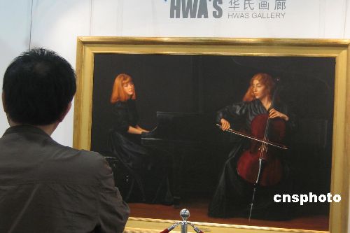 全亞洲最大規(guī)模的藝術(shù)品展示交易平臺——二○○七(第十一屆)上海藝術(shù)博覽會十一月十五日起在上海世貿(mào)商城舉行,眾多海內(nèi)外實力畫廊或機(jī)構(gòu)均攜其得意之作前來參展。圖為由上海華氏畫廊參展的已故大師陳逸飛油畫代表作《二重奏》,這是陳逸飛音樂題材肖像畫中尺寸最大的一幅,也是他當(dāng)年轟動美國藝術(shù)界的重量級油畫作品。中新社發(fā) 孫璐 攝
