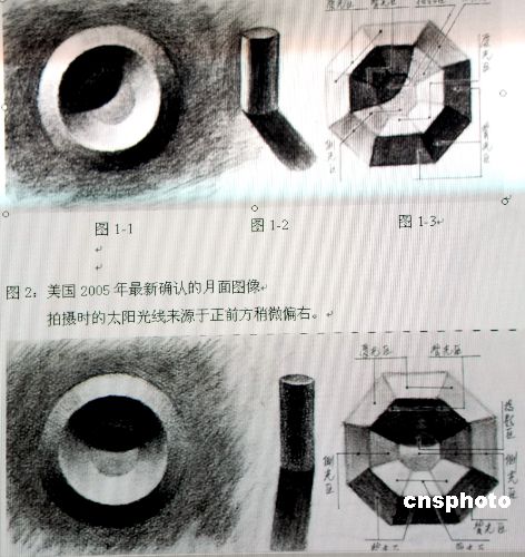 | 2007年12月6日,海南在京的一位畫家從光學(xué)角度找到中美兩“月亮”鮮明差別。中國(guó)嫦娥首幅月球圖像抄襲美國(guó)的傳言,在網(wǎng)上一度鬧得沸沸揚(yáng)揚(yáng),海南省畫家、超常創(chuàng)意專家于廣勝在北京,反復(fù)對(duì)照中美兩圖琢磨研究,從光學(xué)角度發(fā)現(xiàn)兩幅圖象有著“更加鮮明的差別”,6日早晨他發(fā)現(xiàn)兩幅圖像是在不同的光源下拍攝的,從另一側(cè)面有力證明了我國(guó)嫦娥傳回圖像的真實(shí)性。于廣勝說,這一證據(jù)是普通大眾不易發(fā)現(xiàn)的,但通過他所手繪的幾幅圖,即可讓普通大眾一目了然。同時(shí),凡是對(duì)光學(xué)有所研究或通曉繪畫用光、攝影和攝像用光的人們,自然明白其理。為了便于廣大讀者理解,他把地球上的環(huán)形山簡(jiǎn)化為內(nèi)凹外凸的圓臺(tái)(圖1-1、2-1),以顯現(xiàn)不同光線來源下的不同光影效果;由此,又進(jìn)一步簡(jiǎn)化為內(nèi)凹外凸八棱臺(tái)(圖1-3、2-3)并標(biāo)注了光線的來源和受光、測(cè)光、背光區(qū)域;同時(shí),又畫了一個(gè)圓柱體(1-2、2-2)以顯現(xiàn)不同光照角度下的不同投影方向。通過兩組手繪圖,中國(guó)與美國(guó)公布的兩張圖像在拍攝時(shí),太陽光照射月球角度明顯不同,至少左右相差42度左右。中國(guó)拍攝時(shí)的太陽光線來源于左前方,而美國(guó)拍攝時(shí)的太陽光線來源于正前方稍微偏右。于廣勝說,稍有電腦平面制作、攝影和攝像后期制作知識(shí)的人們都明白,圖片與圖片的任意組合拼接是輕而易舉的,但要想把圖片中各個(gè)圖像所有細(xì)節(jié)的光影全部改變是不可能的,“由此可見,我國(guó)嫦娥傳回的圖像其真實(shí)性是不容質(zhì)疑了!毕嚓P(guān)鏈接:12月2日,中國(guó)探月工程首席科學(xué)家、中國(guó)科學(xué)院院士歐陽自遠(yuǎn)做客上!拔膮R講堂”,對(duì)關(guān)于“嫦娥首幅月球圖像抄襲美國(guó)”的傳言作出澄清:“嫦娥傳回的圖像確實(shí)是真實(shí)的,是經(jīng)過非常復(fù)雜的拍攝、傳輸、接收、處理過程后得到的,并且與美國(guó)所拍的圖像有細(xì)微差別”。我國(guó)嫦娥一號(hào)衛(wèi)星所攝的月面圖像上,某個(gè)地方有兩個(gè)小坑,而美國(guó)2005年最新確認(rèn)的月面圖像上,同樣的地方只有一個(gè)小坑。中新社發(fā) 善平 攝