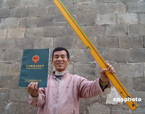12月8日,程成高在展示他發(fā)明的“帶抹砂漿機(jī)構(gòu)的水平尺”。江西省樂平市后港鎮(zhèn)程家村農(nóng)民程成高,只有小學(xué)三年級文化,但他憑借自己的勤奮和智慧,克服困難,用4年的時間,發(fā)明了集抹砂漿與測量水平與一身的“帶抹砂漿機(jī)構(gòu)的水平尺”,并獲得了國家實(shí)用新型專利證書,成為當(dāng)?shù)剞r(nóng)民的典范。另外,他的又一項發(fā)明“滾輪式清掃畚箕”正在申請專利中。中新社發(fā) 石衛(wèi)明 攝