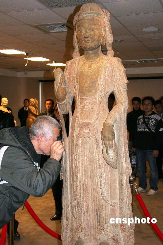 一月四日,一位觀眾在臺灣中華皇家藝術(shù)博物館近距離欣賞首次展出的該館鎮(zhèn)館之寶——國寶級文物“大勢至菩薩”石像。由該館推出的“中華瑰寶系列——宋朝漢白玉十八羅漢特展”當日在臺北開展,造型中西合壁、保存完好,被認為是全球唯一保存最完整的“大勢至菩薩”塑像也同期與觀眾首度見面。據(jù)考證,這尊高一百九十八厘米、石灰石貼金敷彩“大勢至菩薩”為東魏至北齊年間作品,距今約一千六百年至一千四百年。中新社發(fā) 孫自法 攝