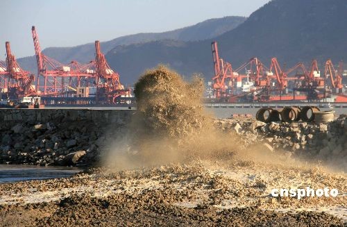 2月17日,在連云港西大堤內側,海底淤泥在巨大的壓力下噴涌而出。連云港港口在碼頭建設中使用先進的“吹填造陸”技術,把疏浚航道挖出的淤泥強力吹填到圍堤中,經(jīng)過沉積后形成陸地,再建設碼頭。