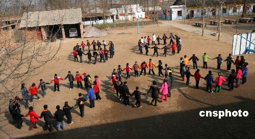 2月22日,啟航學校的留守學生手拉手組成奧運“五環(huán)”標志圖案。當日,陜西興平市趙村鎮(zhèn)啟航學校2008年春季開學,該校240多名留守學生入學報到,老師領著學生們在操場上手拉手組成了奧運“五環(huán)”標志圖案,表達留守孩子們對2008年北京奧運會的期盼和祝福。中新社發(fā) 何建虎 攝