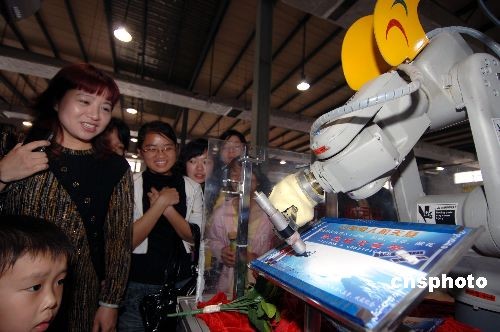 四月八日,一個高科技機器人在福州航天展上為觀眾簽名。當日,中國載人航天實物展在福州金山展覽城開幕,“神舟五號”運載火箭逃逸塔、整流罩等用于實驗的航天實物首次亮相福州。中新社發(fā) 王東明 攝