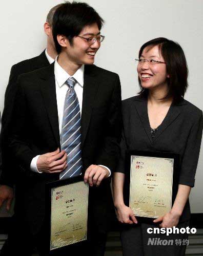 5月7日,清華大學(xué)“清華-杜孟傳播獎(jiǎng)學(xué)金”頒獎(jiǎng)典禮上,獲得此項(xiàng)獎(jiǎng)勵(lì)“最佳創(chuàng)意獎(jiǎng)”的清華學(xué)生侯青楊(右)、“優(yōu)秀策劃案獎(jiǎng)”得主張棟同學(xué),分別獲得赴瑞士日內(nèi)瓦和泰國(guó)曼谷的聯(lián)合國(guó)愛滋病規(guī)劃署實(shí)習(xí)3個(gè)月的機(jī)會(huì)。這兩位清華學(xué)生將與世界各地專業(yè)人士一起為解決世界和中國(guó)可能發(fā)生的由愛滋病引起的嚴(yán)重健康危機(jī)而工作。中新社發(fā) 宋吉河 攝