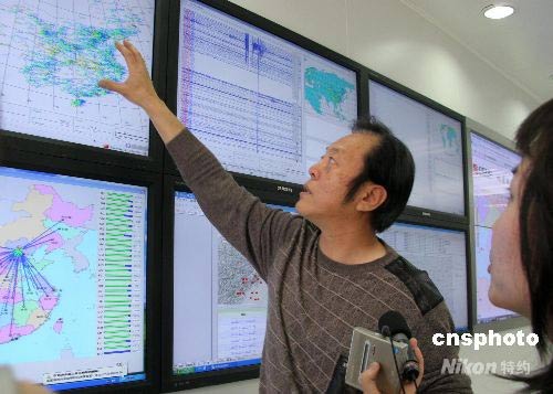五月十三日,中國地震臺網(wǎng)中心地震臺網(wǎng)部副主任田豐向媒體介紹中國地震臺網(wǎng)中心在汶川大地震后對災(zāi)區(qū)余震進(jìn)行監(jiān)測的情況。他說,余震監(jiān)測將為災(zāi)區(qū)地震發(fā)展趨勢研判和一線開展抗震救災(zāi)工作提供監(jiān)測數(shù)據(jù)。中新社發(fā) 孫自法 攝