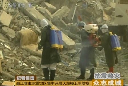 地震救援實施的同時,都江堰市地震災區(qū)展開大規(guī)模衛(wèi)生防疫。(電視截圖)
