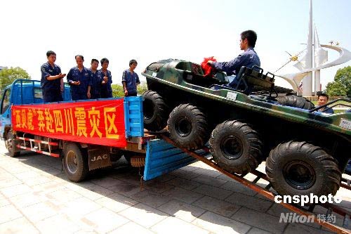 5月18日,由浙江義烏西貝文良特種車輛有限公司,捐贈(zèng)給四川消防總隊(duì)的一輛“西貝虎”新型水陸兩棲全地型功能車,從義烏出發(fā),晝夜兼程趕往四川德陽,投入抗震救災(zāi)。中新社發(fā) 張建成 攝