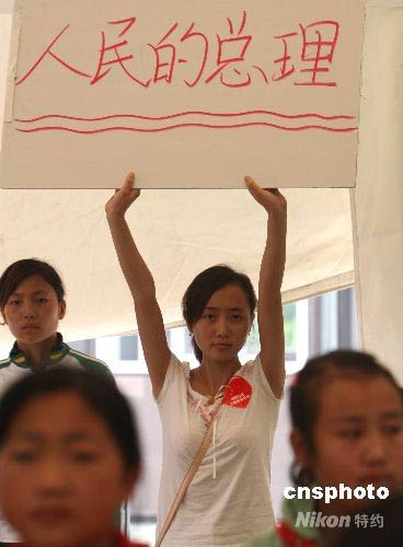 5月23日上午9時許,中國國務院總理溫家寶來到四川綿陽,到九洲帳篷學?赐卣馂膮^(qū)學生。在現(xiàn)場的一名青年教師雙手高舉“人民的總理”標語,表達對溫總理的愛戴和感激。中新社發(fā) 趙振清 攝