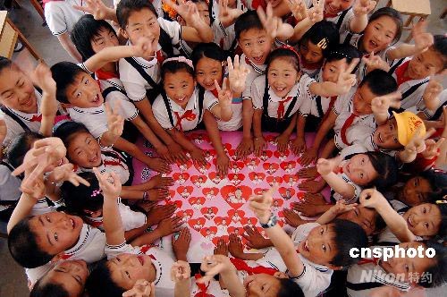 2008年5月30日,來(lái)自四川綿陽(yáng)地震災(zāi)區(qū)、在日照市經(jīng)濟(jì)開發(fā)區(qū)第二小學(xué)上學(xué)的3名學(xué)生,在新學(xué)校與老師同學(xué)們歡慶“六一”兒童節(jié)。日照經(jīng)濟(jì)開發(fā)區(qū)第二小學(xué)的師生為3名同學(xué)送上精美禮物,祝福他們和四川地震災(zāi)區(qū)的小朋友節(jié)日快樂。近日,山東日照市教育部門安排3名投奔親友的四川地震災(zāi)區(qū)小學(xué)生就近在日照經(jīng)濟(jì)開發(fā)區(qū)二小上學(xué),學(xué)校為這3名學(xué)生捐贈(zèng)了學(xué)習(xí)用品,并減免費(fèi)用。中新社發(fā) 陳為峰 攝