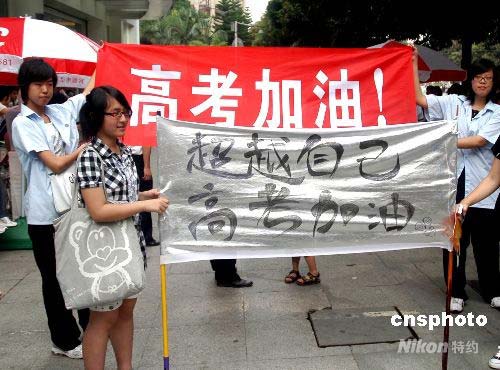 2008年6月7日,福州三中考點,該校高一的學(xué)弟學(xué)妹們拉起“超越自己,高考加油”的橫幅為參加考試的學(xué)長們加油,同時也親身體驗一下高考的緊張氛圍。中新社發(fā) 張 斌 攝