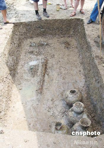 2008年7月24日,蘇州博物館考古工作者對(duì)蘇州相城區(qū)古宮黃泥村的一座西漢古墓進(jìn)行發(fā)掘,該古墓出土了一批墓葬品,共有3組6件,包括青銅鏡、陶壺、陶瓿和陶罐以及釉陶,都是兩個(gè)一對(duì)的組合,不僅器形較大,釉色更好,而且保存完好。據(jù)了解,該墓葬長(zhǎng)3.15米,寬1.60米,被確定為西漢時(shí)期,墓葬規(guī)模以及隨葬品都超過(guò)以往發(fā)現(xiàn)的同年代墓葬,具有一定的價(jià)值。中新社發(fā) 朱子寒 攝