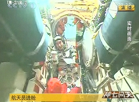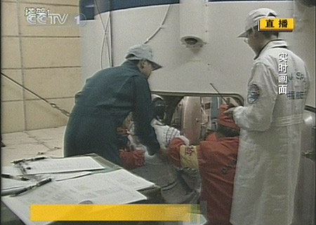 25日18時(shí)25分許,神舟七號三名航天員陸續(xù)進(jìn)艙。第一名進(jìn)艙的是景海鵬,第二名進(jìn)艙的是劉伯明,最后,指令長翟志剛也開始進(jìn)入。