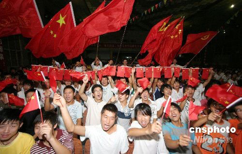 9月25日21時(shí)33分,北京航天飛控中心宣布“神七”發(fā)射成功。重慶科創(chuàng)職業(yè)學(xué)院大禮堂里觀看電視直播的2000多名學(xué)生頓時(shí)揮舞著手中的國(guó)旗歡呼雀躍。21時(shí)10分,搭乘著翟志剛、劉伯明、景海鵬3位航天員的神舟七號(hào)飛船在中國(guó)酒泉衛(wèi)星發(fā)射中心發(fā)射升空,這是神舟飛船第七次飛入太空,也是中國(guó)人第三次登上太空。中新社發(fā) 陳仕川 攝