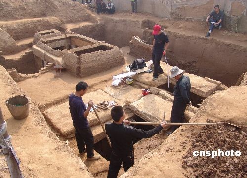 10月15日,考古人員正在挖掘漢墓。近日,在山東省沂南縣磚埠鎮(zhèn)發(fā)現(xiàn)占地約3000平方米的東漢家族墓葬群,經過上級部門批準,考古人員對其中兩座墓穴進行了搶救性科學挖掘,目前已經發(fā)掘出土8件釉陶壺在內的大量文物,墓內石壁上有多幅畫像,清晰可見。中新社發(fā) 杜昱葆 攝