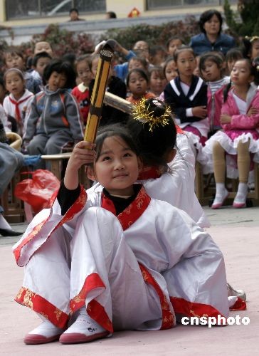 10月29日,山東威海長峰小學(xué)在校園內(nèi)以“詩詞曲賦潤心田 傳統(tǒng)文化駐校園”為主題開展校園文化節(jié)活動。在文化節(jié)上,學(xué)生們將在《論語》、《弟子規(guī)》等經(jīng)典課本所學(xué)、所悟、所得,在老師的指導(dǎo)下,編排成節(jié)目展示出來。 據(jù)介紹,兩年來,學(xué)校通過以經(jīng)典古文誦讀為突破口,使傳統(tǒng)文化常駐校園。中新社發(fā) 海云飛 攝