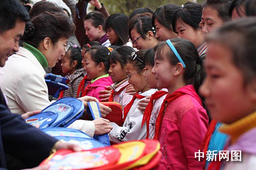 甘肅省人口委、共青團甘肅省委、蘭州市政府官員為結(jié)對幫教的女大學生志愿者頒發(fā)證書,為女童贈送書包等。