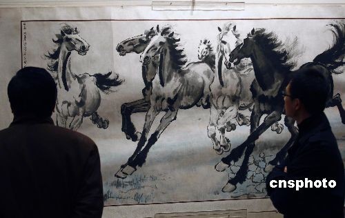 3月10日,“中國(guó)現(xiàn)代美術(shù)奠基人系列展·徐悲鴻大型藝術(shù)展”在北京炎黃藝術(shù)館舉行,一幅著名的國(guó)畫作品《群奔》吸引參觀者目光。本次展覽由北京市文化局、徐悲鴻紀(jì)念館和炎黃藝術(shù)館聯(lián)合主辦,共展出80多件徐悲鴻真跡,涵蓋了徐先生各個(gè)時(shí)期的代表作,其中包括他早期的素描《馬與馬夫》、《女人體》、《自畫像》等。中新社發(fā) 鄭雄增 攝