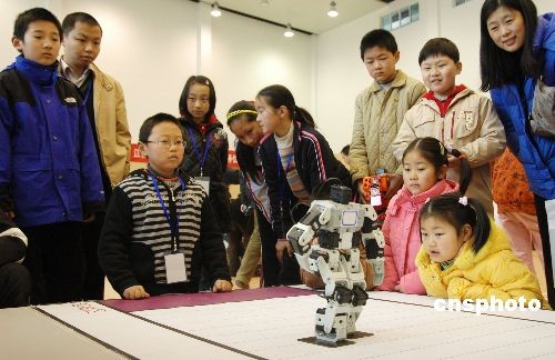 2009年3月29日,2009年“VEX”杯蘇州市青少年機(jī)器人比賽在蘇州善耕實(shí)驗(yàn)小學(xué)開幕,來自蘇州敬文實(shí)驗(yàn)小學(xué)及其周邊縣市的77所中小學(xué)校的467位選手參賽,參賽者分別進(jìn)行了機(jī)器人“踢足球”、“滅火”和“基本技能”等八個(gè)項(xiàng)目的角逐,場(chǎng)面十分熱鬧。中新社發(fā) 蘇民 攝