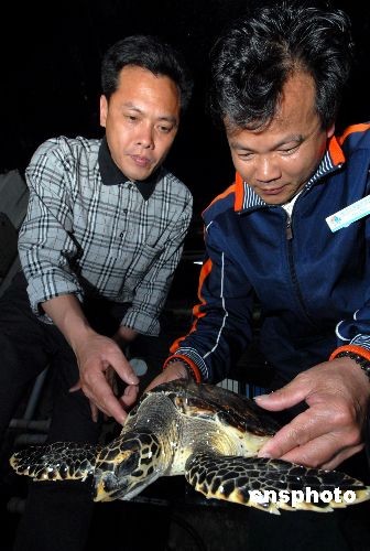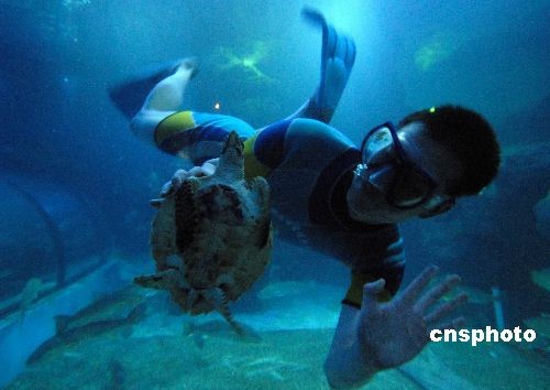 4月13日,福州一漁民將其幾天前在海邊偶然發(fā)現(xiàn)的“玳!焙}斔瓦M(jìn)福州左海海底世界。這只“玳瑁”長約12厘米,重約1750克,嘴如鷹嘴,甲殼為褐色,頜緣鋸齒狀。據(jù)飼養(yǎng)員介紹,這只小海龜大約才2歲,還屬于“嬰兒”狀態(tài)!扮殍!庇址Q十三鱗,屬于國家二級保護動物,一般壽命可達(dá)1500歲,成年的玳瑁(約20多歲)身長1米,體重40~60公斤,主要生長于熱帶及亞熱帶地區(qū)的暖水性海洋。該類海龜在中國主要分布于臺灣、福建和海南等沿海一帶海域。 中新社發(fā) 穆長梓 攝