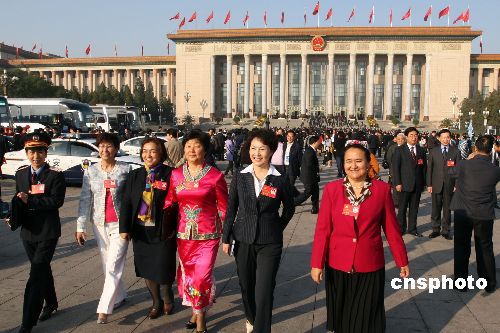 中國共產(chǎn)黨第十七次全國代表大會(huì)10月21日上午在北京人民大會(huì)堂閉幕,圖為新疆代表團(tuán)的各族代表走出會(huì)場。中新社發(fā) 任晨鳴 攝