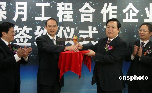 十月十九日,備受矚目的中國探月工程在北京簽署首家合作企業(yè),中國國防科學技術(shù)工業(yè)委員會協(xié)作配套中心與湘電集團有限公司簽署合作協(xié)議,共同對中國探月工程品牌進行市場開發(fā)和推廣。圖為國防科工委秘書長黃強(左二)出席簽約儀式,并向中國探月工程首家合作企業(yè)贈送“嫦娥一號”衛(wèi)星模型。中新社發(fā) 孫自法 攝