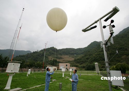 10月22日,西昌衛(wèi)星發(fā)射中心氣象室工作人員正在施放高空探測氣球,搜集高空風(fēng)速、風(fēng)向和云層的變化情況。該中心航天發(fā)射場氣象變化非常復(fù)雜,每年有一百二十余天的雷電陰雨天氣。中國國防科工委當(dāng)晚在北京宣布,“嫦娥一號”衛(wèi)星將于24日至26日擇機在西昌衛(wèi)星發(fā)射中心發(fā)射,首選發(fā)射窗口為24日18時左右。中新社發(fā) 秦憲安 攝