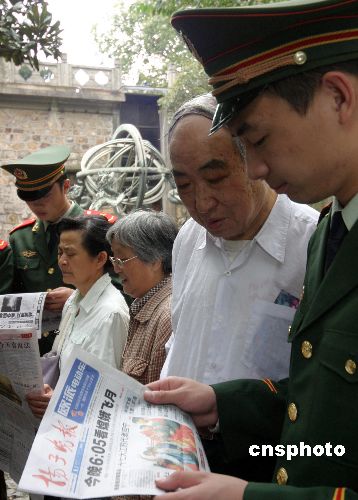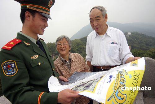 10月24日,擔(dān)負(fù)南京中科院紫金山天文臺(tái)守衛(wèi)任務(wù)的武警江蘇總隊(duì)某部官兵在向游客講解月球相關(guān)天文知識(shí)、分發(fā)天文知識(shí)的宣傳資料。當(dāng)天嫦娥一號(hào)即將發(fā)射。中新社發(fā) 唐占軍 攝