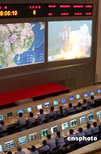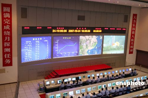 十月二十四日傍晚,中國首顆月球探測衛(wèi)星——嫦娥一號發(fā)射成功。圖為北京航天飛行控制中心監(jiān)控衛(wèi)星發(fā)射情況。中新社發(fā) 毛建軍 攝