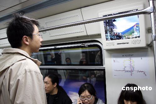 10月24日,北京市民在地鐵里通過移動(dòng)電視觀看“嫦娥一號(hào)”奔月實(shí)況。北京時(shí)間十八時(shí)零五分,中國在西昌衛(wèi)星發(fā)射中心用“長征三號(hào)甲”運(yùn)載火箭將“嫦娥一號(hào)”衛(wèi)星成功送入太空。據(jù)悉,這次新聞?lì)l道將連續(xù)三天推出“嫦娥一號(hào)”特別節(jié)目,市民還可以通過中央國際網(wǎng)站和CCTV無線互聯(lián)網(wǎng)觀看奔月盛況。中新社發(fā) 鄭雄增 攝