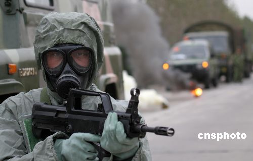 10月27日,“鐵拳-2007”實(shí)兵檢驗(yàn)性演習(xí)拉開(kāi)帷幕。10月28日,鐵拳2007機(jī)步師實(shí)兵檢驗(yàn)性演習(xí)部隊(duì)在機(jī)動(dòng)途中展開(kāi)防持久毒劑襲擊,化學(xué)偵察,道路消毒,裝備消毒,人員消毒等科目演練。中新社發(fā) 曾憲平 攝