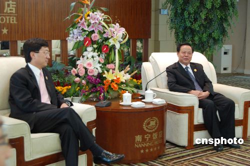 十月二十九日,廣西壯族自治區(qū)主席陸兵(右)在南寧會見香港貿(mào)發(fā)局總裁林天福一行,雙方會談后表示,利用各自優(yōu)勢,加強物流方面的合作,實現(xiàn)桂港共同發(fā)展。中新社發(fā) 劉萬強 攝