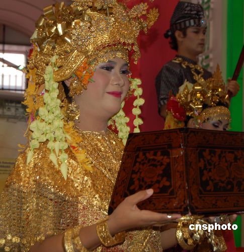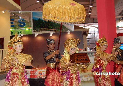 圖為身著民族盛裝的印尼藝人在展示印尼風(fēng)情。