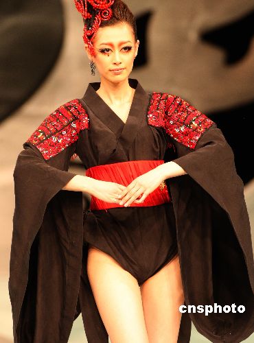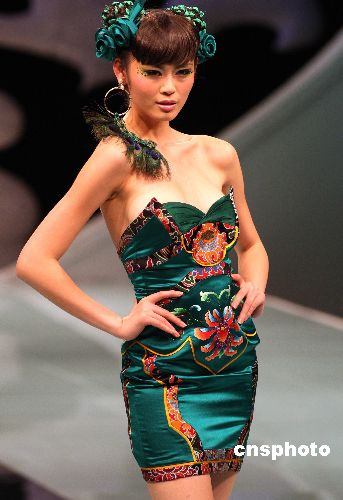 11月3日晚,在北京中國國際時裝周上著名時裝品牌NE·TIGER推出“錦繡國色華夏禮服”NE·TIGER2008高級華服發(fā)布會,設(shè)計師張志峰在禮服色彩搭配以及款式風(fēng)格上大膽創(chuàng)新,以中華傳統(tǒng)民族文化為底蘊,融合現(xiàn)代時裝多元素風(fēng)格突出作品自然質(zhì)樸又呈現(xiàn)出高貴而莊重的氣質(zhì)。圖為模特展示該品牌推出的最新設(shè)計作品。中新社發(fā) 錢興強 攝