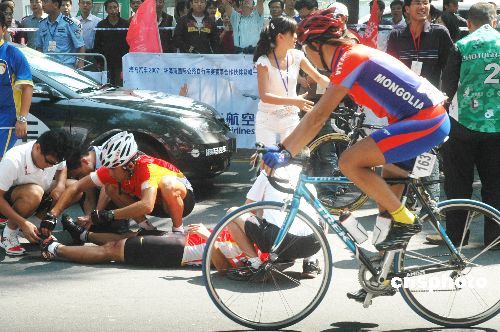 2007年11月6日,“海馬汽車杯”環(huán)海南島國際公路自行車賽進入第三賽段文昌——?诒荣悺8鲊x手在歷經(jīng)總里程125公里后,快速沖刺設(shè)在?谑袨I海大道的終點站時,一名在劃線內(nèi)的記者突然探頭出來搶拍照片,結(jié)果被撞頭破血流,相機摔破,而兩名選手人仰馬翻摔成重傷,另一選手被擦輕傷,當時的驚險場面引起觀賽者一片驚呼聲。中新社發(fā) 善平 攝