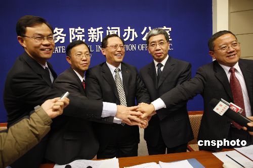 11月26日下午,繞月探測(cè)工程領(lǐng)導(dǎo)小組副組長(zhǎng)、國(guó)防科工委副主任、航天局局長(zhǎng)孫來(lái)燕(中),繞月探測(cè)工程測(cè)控系統(tǒng)副總指揮、北京航天飛行控制中心主任朱民才(左二),繞月探測(cè)工程副總指揮、航天科技集團(tuán)公司副總經(jīng)理雷凡培(右二),中國(guó)科學(xué)院空間科學(xué)與應(yīng)用中心主任吳季(右)以及國(guó)新辦新聞局副局長(zhǎng)華清(左),在國(guó)務(wù)院新聞辦公室舉行的新聞發(fā)布會(huì)上,共同慶祝中國(guó)首次月球探測(cè)工程的圓滿成功。當(dāng)日,國(guó)務(wù)院新聞辦公室邀請(qǐng)中國(guó)繞月探測(cè)工程領(lǐng)導(dǎo)小組副組長(zhǎng)、國(guó)防科工委副主任、國(guó)家航天局局長(zhǎng)孫來(lái)燕等介紹中國(guó)首次月球探測(cè)工程等方面情況,并答記者問(wèn)。中新社發(fā) 杜洋 攝