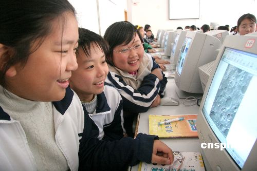 11月27日,威海古寨中學(xué)的學(xué)生上網(wǎng)查看“嫦娥一號”衛(wèi)星傳回的第一幅月面圖像。當(dāng)日,威海一中學(xué)開展“學(xué)科技激發(fā)航天熱”活動,同學(xué)們通過上網(wǎng)查看、老師講解、小組討論等形式了解“嫦娥一號”衛(wèi)星及其相關(guān)的天文知識。中新社發(fā) 海云飛 攝