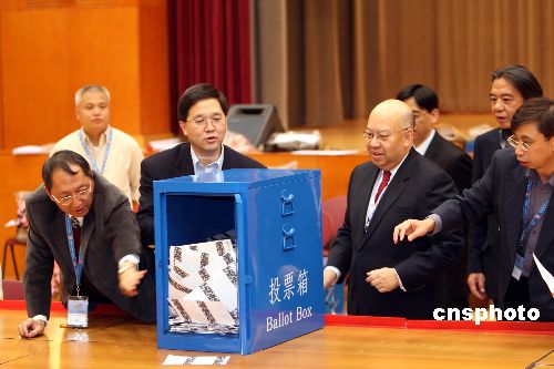 12月2日深夜,香港政制及內(nèi)地事務局局長林瑞林[左二]、香港選舉管理委員會主席彭鍵基法官[右]到社區(qū)綜合大樓點票站視察點票情況。此次香港立法會港島區(qū)補選共有八名候選人競逐一個議席,分別是:柳玉成、李永健、蕭思江、葉劉淑儀、蔣志偉、凌尉云、陳方安生、以及何來。