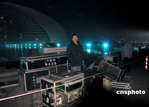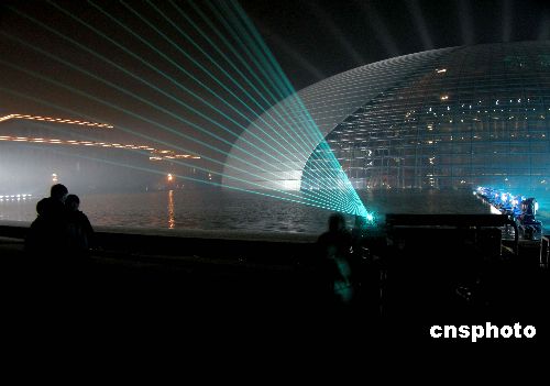 2007年12月20日晚,北京人民大會堂西側(cè),營造國家大劇院燈光效果的設(shè)施全部調(diào)試成功,大劇院被布置完畢的燈光照射出高雅的藍調(diào)色彩。12月21日國家大劇院將迎來首場演出。中新社發(fā) 博芽影像 攝