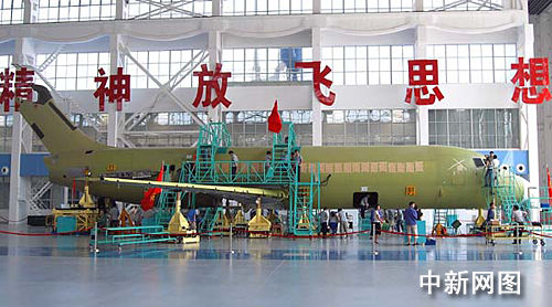 中國首架自主知識產(chǎn)權(quán)的噴氣支線客機ARJ21正在總裝中。