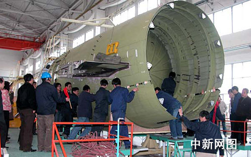 中國首架自主知識(shí)產(chǎn)權(quán)的噴氣支線客機(jī)ARJ21總裝前中后機(jī)身上下對合。