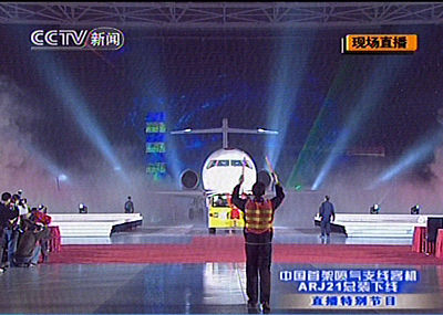 由中國航空工業(yè)第一集團公司(中國一航)自行研制生產(chǎn)的中國首架自主知識產(chǎn)權噴氣支線客機ARJ21-700飛機(中文名“翔鳳”),2007年12月21日下午在上海飛機制造廠舉行盛大的總裝下線儀式。(電視截圖)