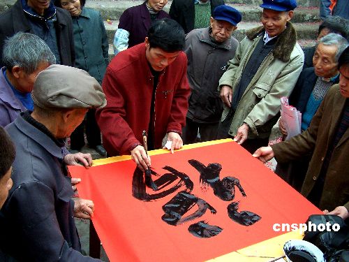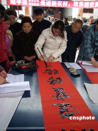 12月30日,書法家在仙回瑤族鄉(xiāng)伏龍村為瑤胞書寫春聯(lián)。當日,廣西昭平縣書法家協(xié)會10名書法家自帶筆墨紙張和伙食,驅(qū)車來到大山深處的仙回瑤族鄉(xiāng)伏龍村,現(xiàn)場為150戶瑤胞書寫春聯(lián)、贈送春聯(lián),為瑤胞送來新年祝福。中新社發(fā) 喻湘泉 攝