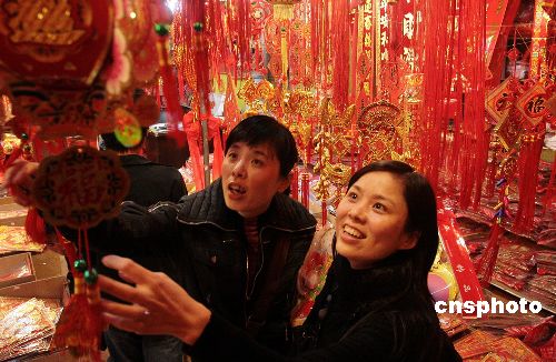 十二月三十一日,為了迎接新年,福建泉州購買喜慶用品的市民絡繹不絕,市場熱鬧非凡!氨瘛睊旒⒉薀、“中國結”等的銷售異常火爆,家家戶戶都將自家里里外外裝點一新迎接新年。中新社發(fā) 傅丹丹 攝