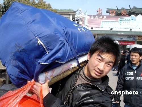 2月17日,返蘇民工扛著包裹從蘇州火車(chē)站走出。近日,外來(lái)務(wù)工人員返回蘇州呈現(xiàn)高峰,蘇州火車(chē)站客流量明顯上升。據(jù)悉,蘇州火車(chē)站平均日接收外來(lái)民工達(dá)3萬(wàn)余人。中新社發(fā) 王建康 攝